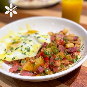 Our seasonal Corned Beef Hash makes for a classic brunch. Savory corned beef with peppers, onions & potatoes, tossed in a light ranchero sauce and